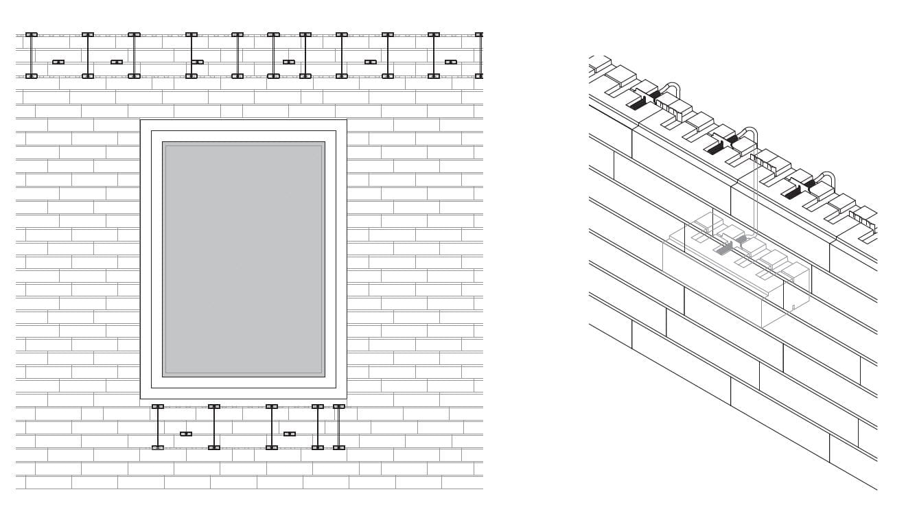 De horizontale eindes van gevels moet je extra verankeren. Dan gaat het bijvoorbeeld om de bovenste drie lagen onder de opening in de buitengevel en op de plek van dakranden. Voor het samenvoegen van deze drie lagen, heb je een muurbeëindigingsklem nodig. Deze bevestig je met een rvs verankeringsclip vóórdat de drie laatste lagen worden geplaatst. De muurbeëindigingsklem gaat aan de achterkant van de stenen weer drie lagen omhoog. En wordt daarna geklemd in één van de vier uitsparingen van de bovenste steen, met alweer een rvs verankeringsclip.