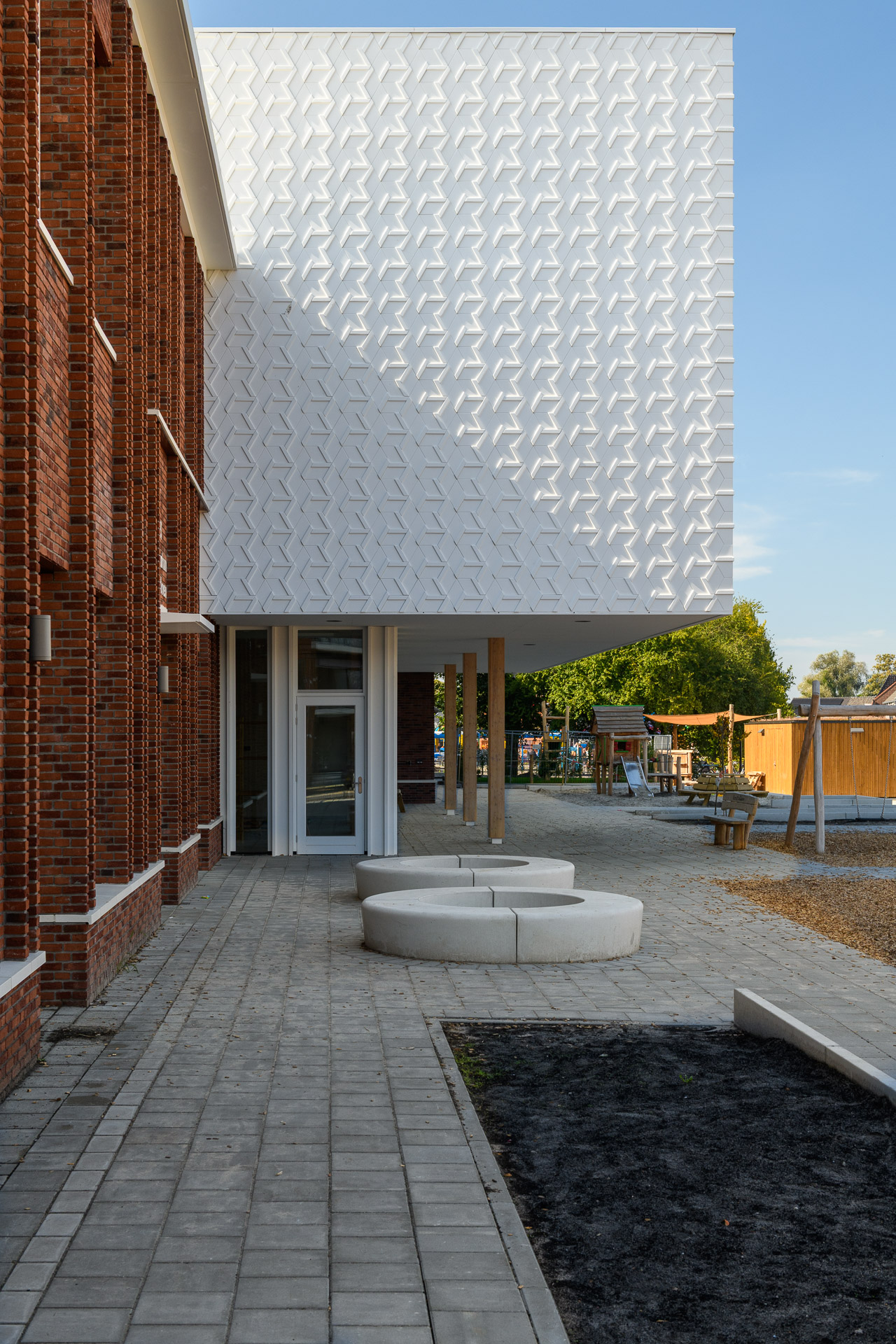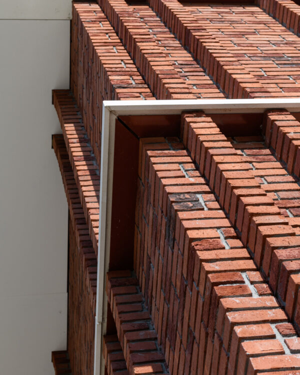Het ontwerp van 19 Het Atelier sluit aan bij de jaren ’50-architectuur van de wijk. De architectuur wordt dan ook in belangrijke mate bepaald door deze context: de kleurstelling, materialisatie en elementen zoals spekbanden en dakranden zijn hiervan een afgeleide. Rode baksteen, spekbanden, penanten en royale dakoverstekken vormen de basis van het gebouw. Tegelijkertijd is het ontwerp sterk gericht op de schaal en beleving van het kind. “We hebben het gebouw verfijnd om de schaal terug te brengen naar die van het kind,” legt Ruben uit. “Dat zit niet in één detail, maar in het totaalbeeld.” De afwisselende ritmiek van de penanten en verspringende spekbanden speelt hierin een belangrijke rol, evenals de toepassing van verschillende metselwerkverbanden, zoals Vlaams verband en blokverband. Nog verfijnder is de subtiele combinatie van handvormstenen en wasserstrichstenen. De architectuur is bewust rustig gehouden, zodat materialen en details hun werk kunnen doen.