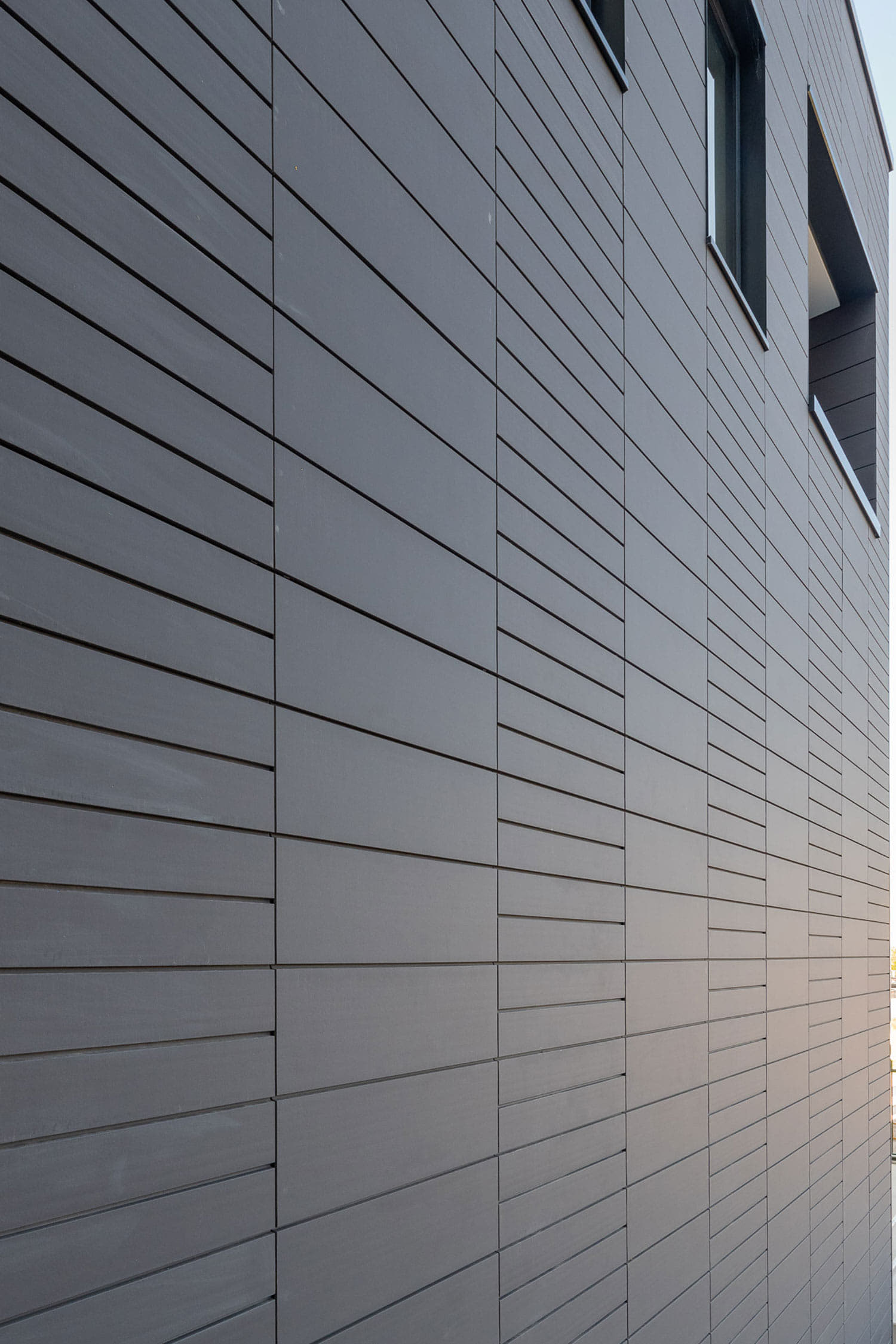 Als importeur van Argeton, leverde Aberson de keramische tegels voor de gevel. De keuze viel op 2 typen: Tampa en Terzo. De tegels zijn van dezelfde kleur en hebben hetzelfde formaat (30 cm hoog). De extra diepe ril van de tweede tegel zorgt optisch voor een extra voeg. Door met twee typen Argeton in één kleur te werken, ontstond een afwisselend en subtiel beeld.