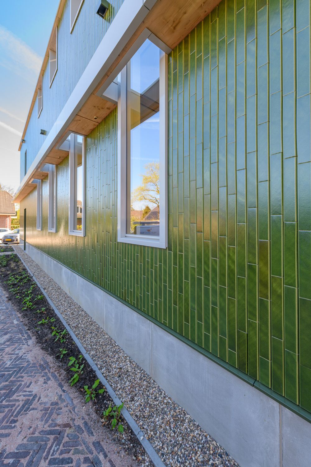 De groene gevel met de circulaire Waste glaze, een verglazing ontwikkelt uit gerecycled glas en huisvuil, van Dijkstra Friese Kleiwaren was dan ook een logische keuze. Bart: “Via Dijkstra werden we op het circulaire A-Brick gevelsysteem van Aberson gewezen. Dit maakt het verhaal van het ontwerp sluitend, omdat daardoor de gevel in z’n totaliteit circulair is.”